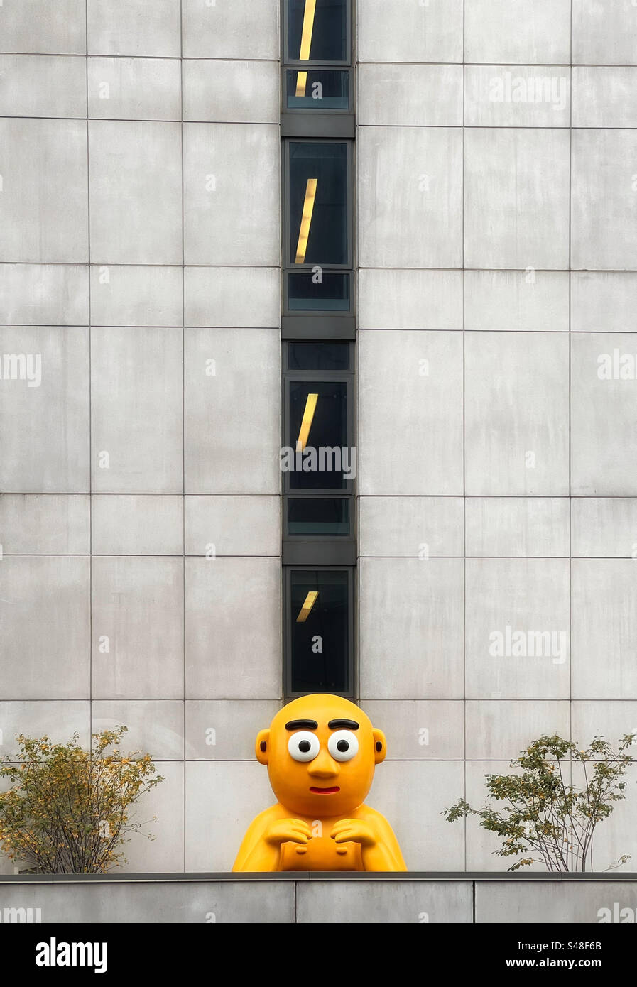 Cartoon like character in yellow peeping over wall of skyscraper on