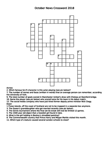 October 2018 UK and beyond Current Affairs Crossword Quiz Teaching
