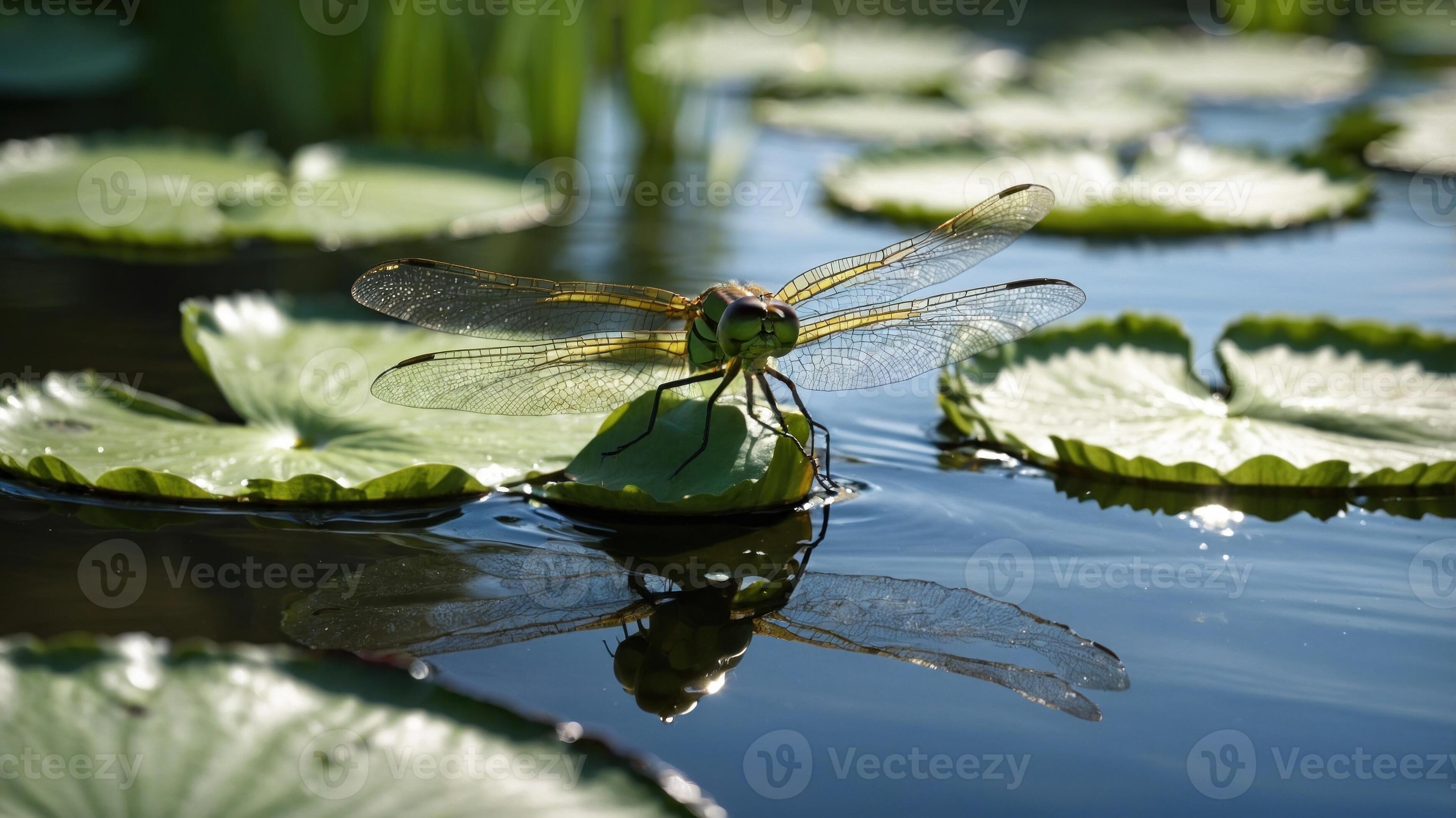 Dragonfly perched on a lily pad in a serene pond reflecting in the