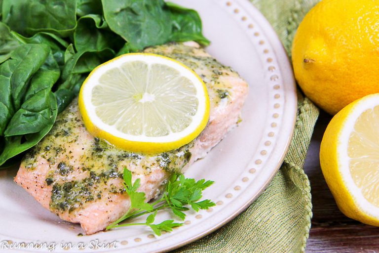 Easy Baked Lemon Pesto Salmon Recipe Running in a Skirt