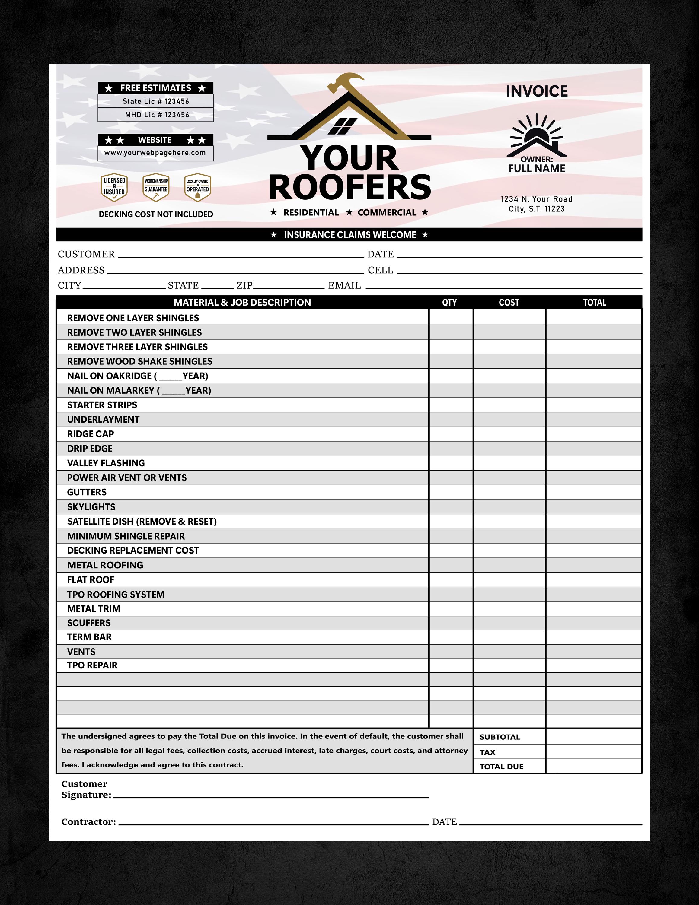 Roofing Invoice Template for Contractors Editable Form for Roof