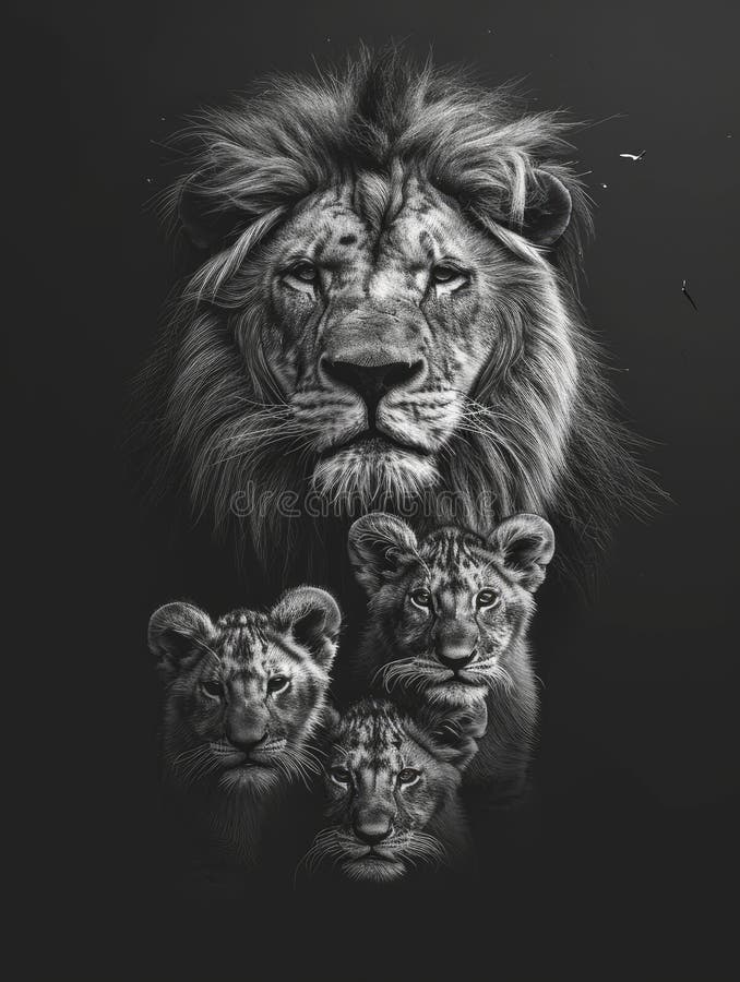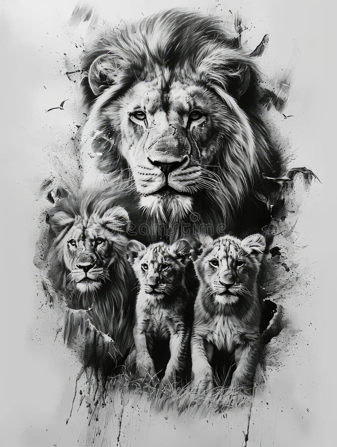Lioness with Lion Cubs Image As a Tattoo Template Stock Illustration