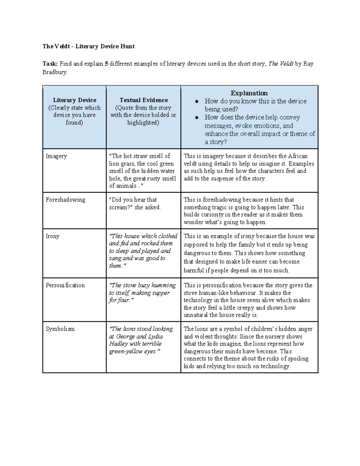 ENG2DE The Veldt Literary Devices Analysis Chart Studocu