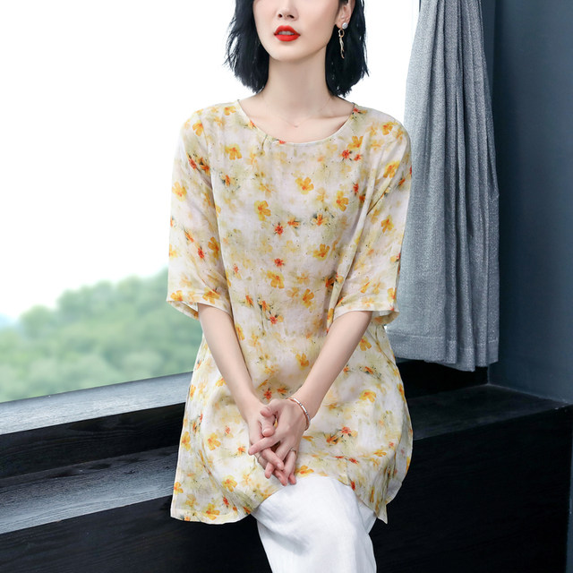 Summer new high end pure ramie top women #39 s mid sleeve loose round neck