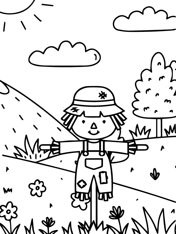 Little Scarecrow is standing in flower garden