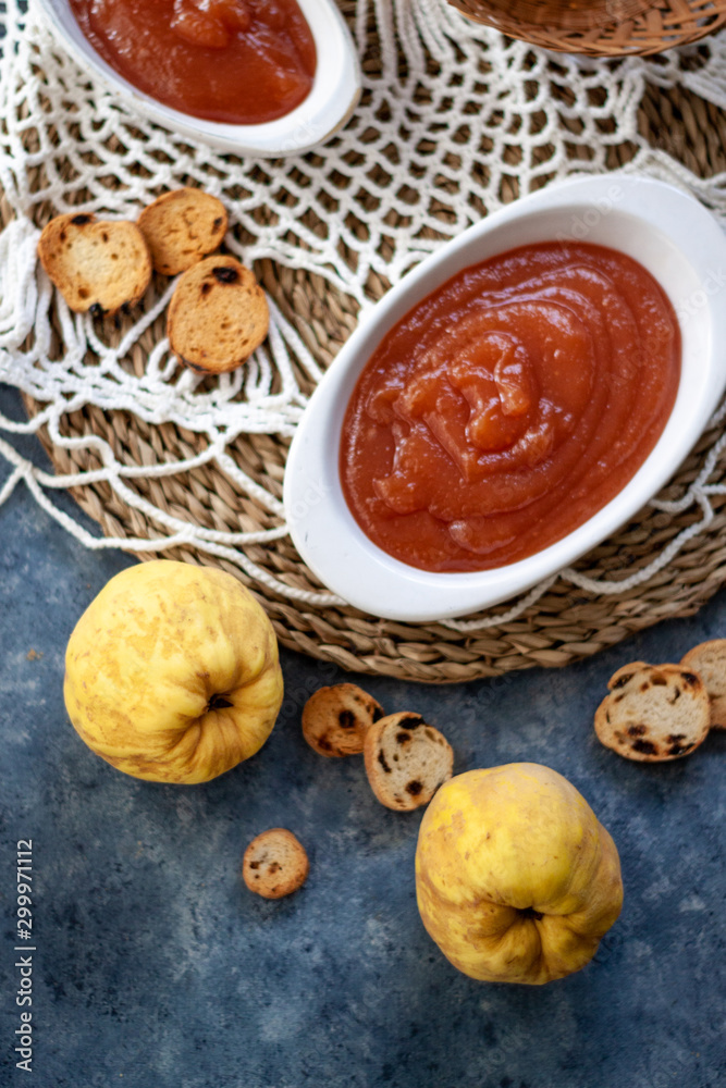 Quince Close up with a jelly quince in a white crockery containers and