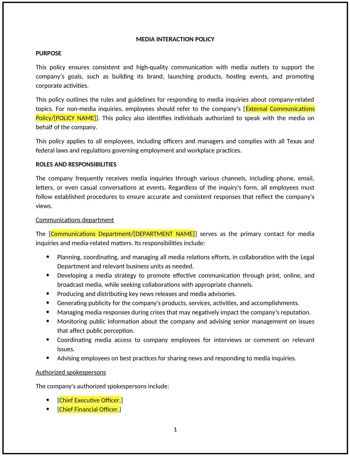 Media relations policy (Texas): Free template