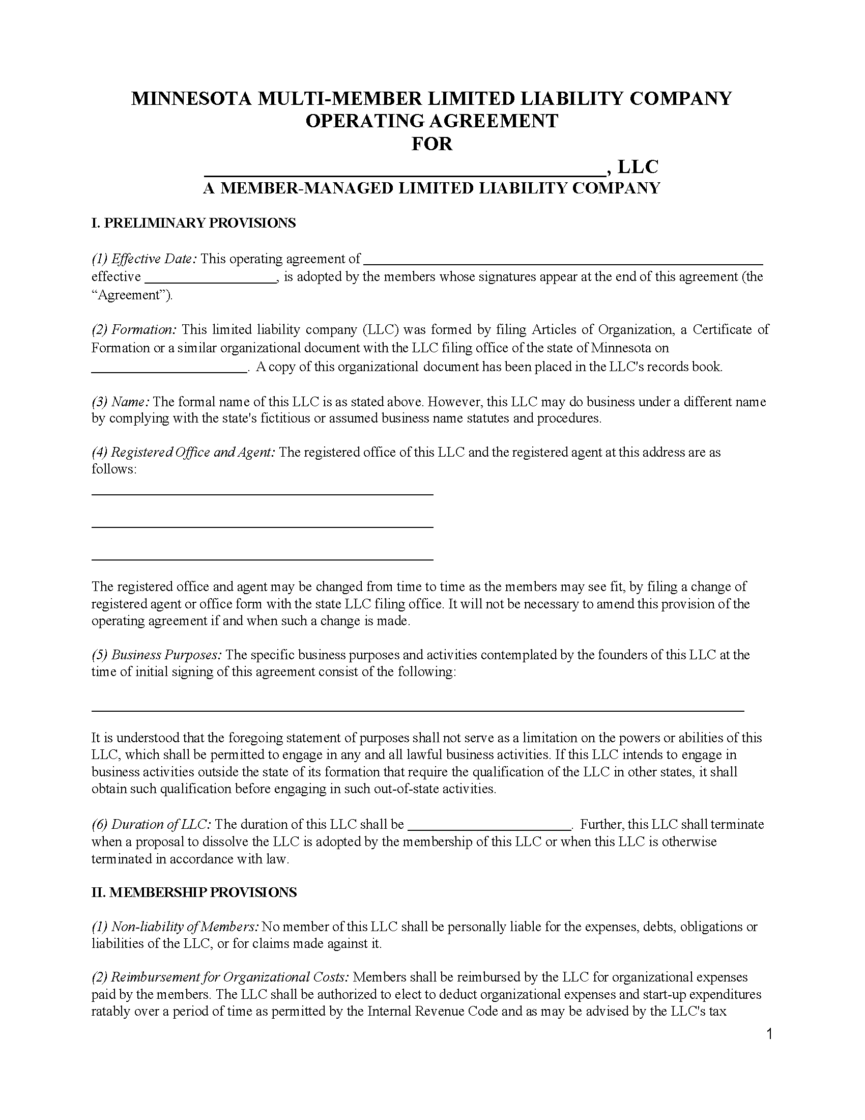 Free Minnesota Multi Member LLC Operating Agreement Templates (5