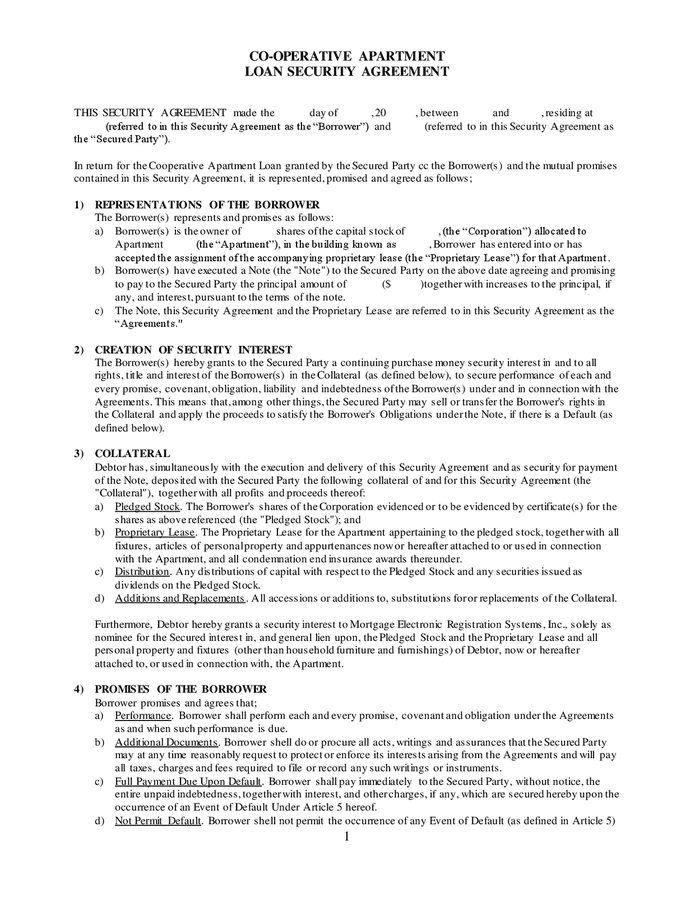 Co operative apartment loan security agreement in Word and Pdf formats