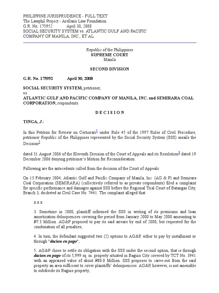 SSS vs Atlantic Gulf and Pacific Company of Manila Inc and Semirara