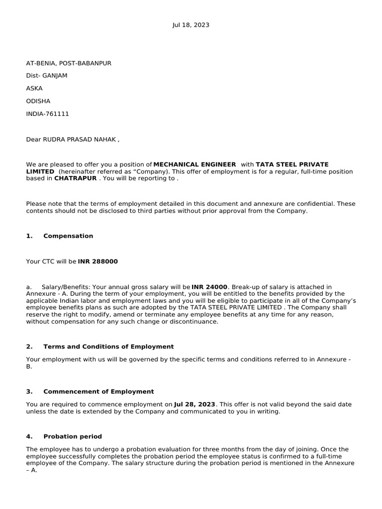 Offer Letter RUDRA PRASAD NAHAK PDF Employment Government