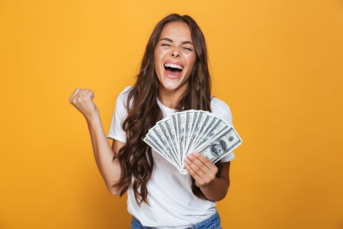 Portrait Cheerful Young Woman Holding Money Stock Photo 1038717511