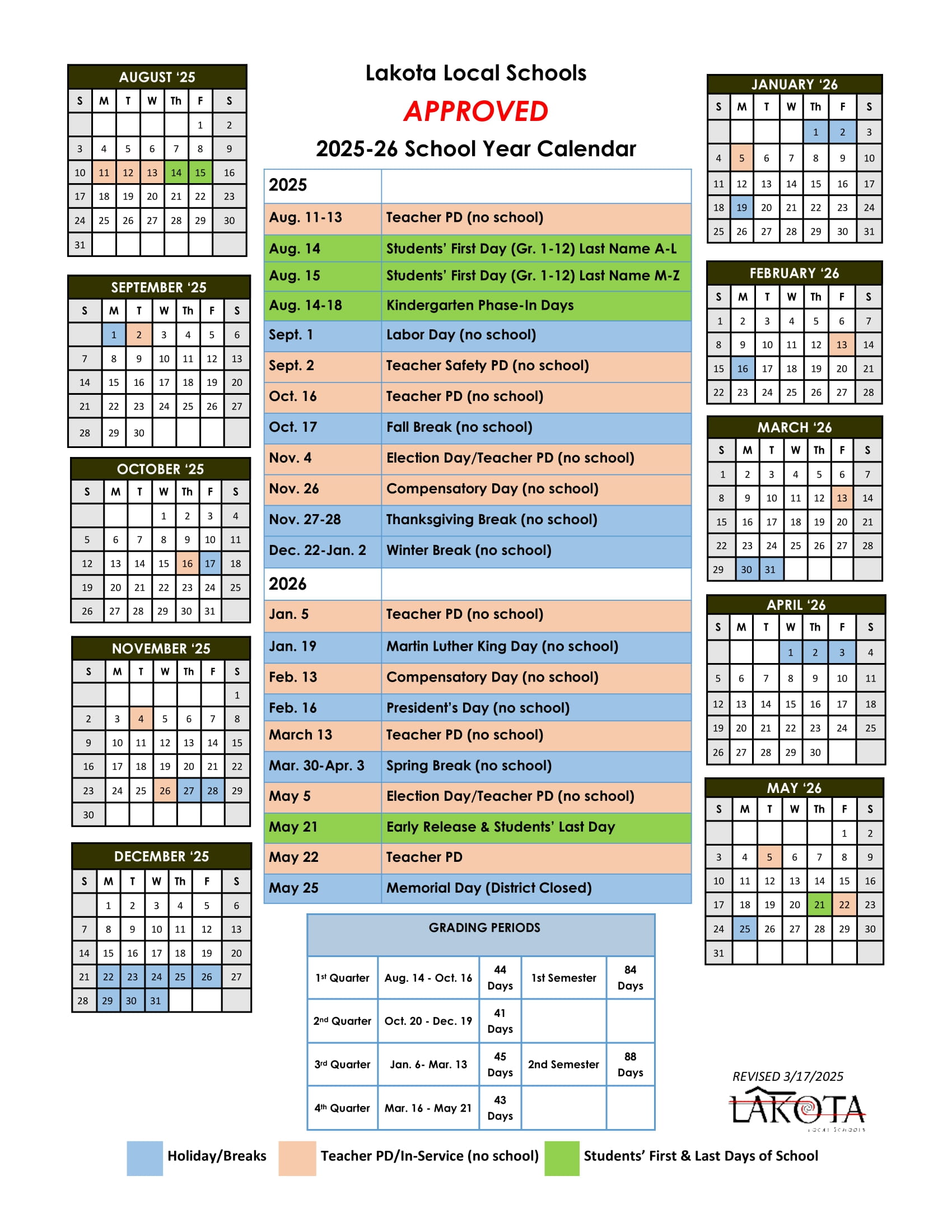 Lakota Local School District Calendar 25 26 Revised PDF EduCounty