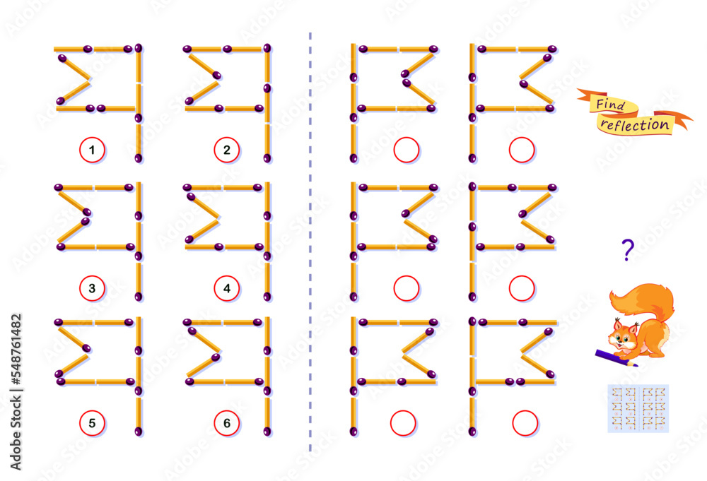 Logic Puzzle Game for Kids Need To Find Correct Reflection for Each