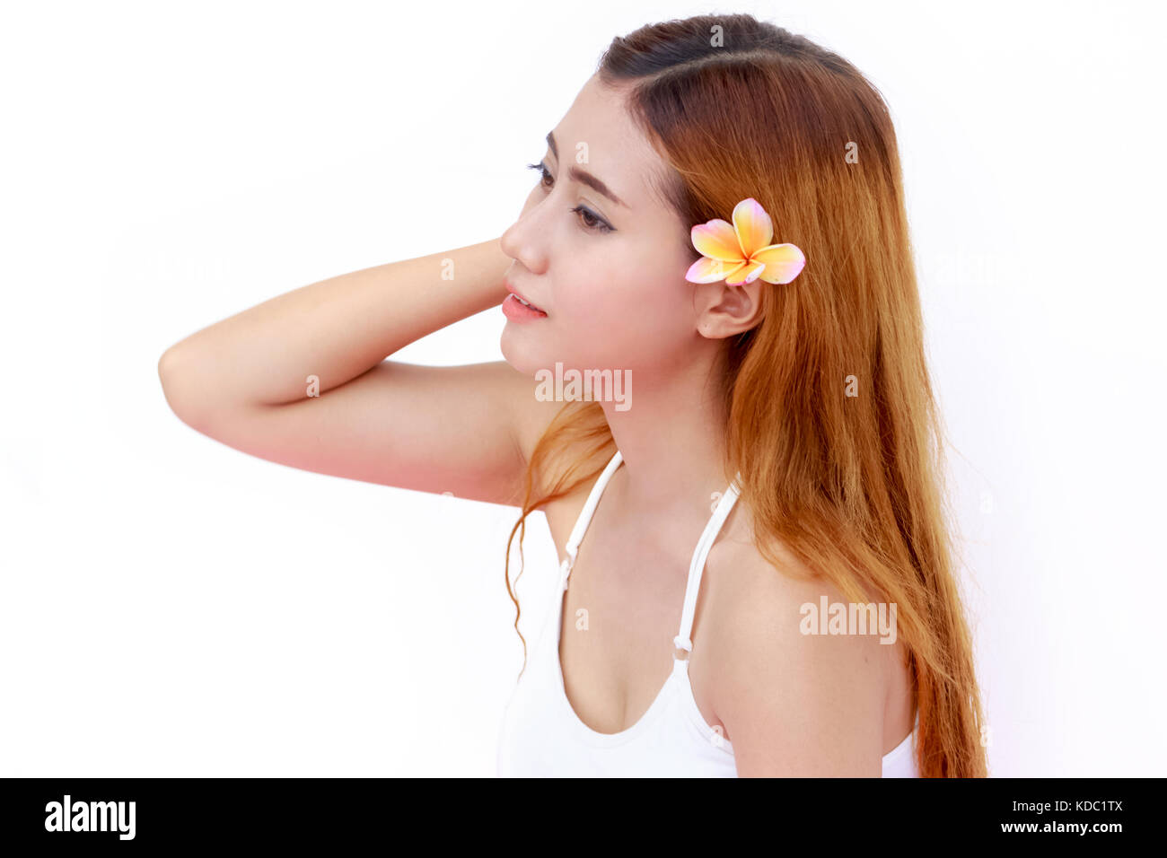 Beautiful Asian long hair female with flower on white background Stock