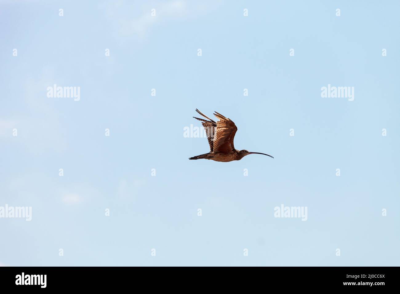 Long billed curlew bird Numenius americanus flies over a marsh in Bolsa