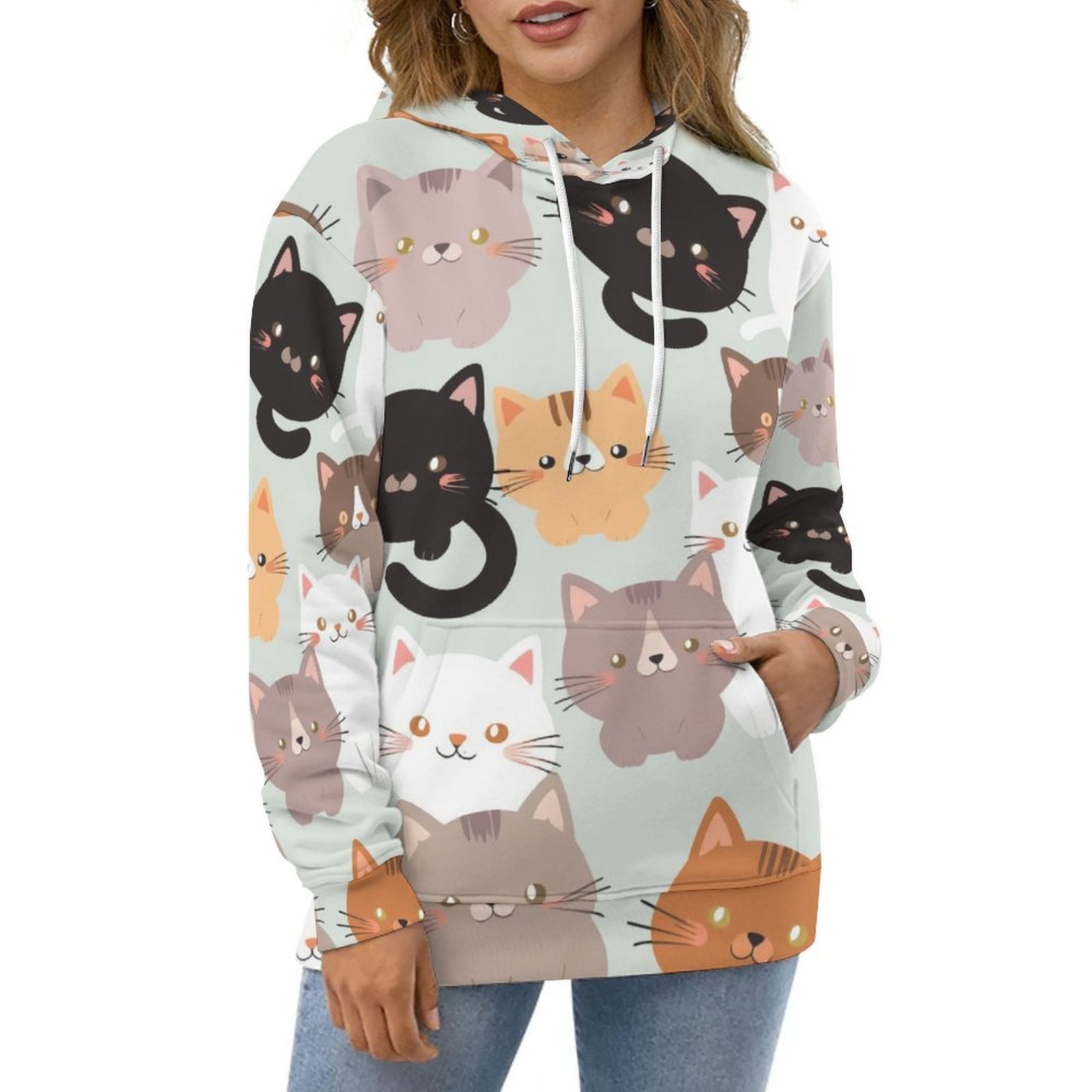 Casual Hoodies Cute Cat Pattern Lady Long Sleeve Classic Design Loose