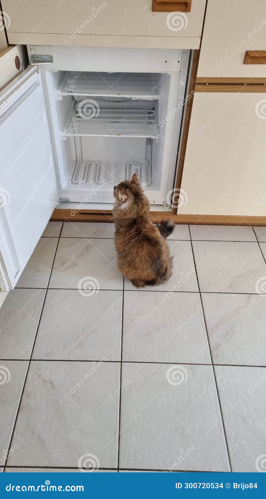 Tabby Domestic Long Haired Feline in Front of Empty Freezer Stock Photo