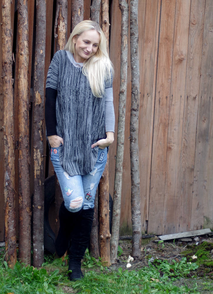 Long Knit Tunic With Different Color Sleeves Tunic Black and Grey