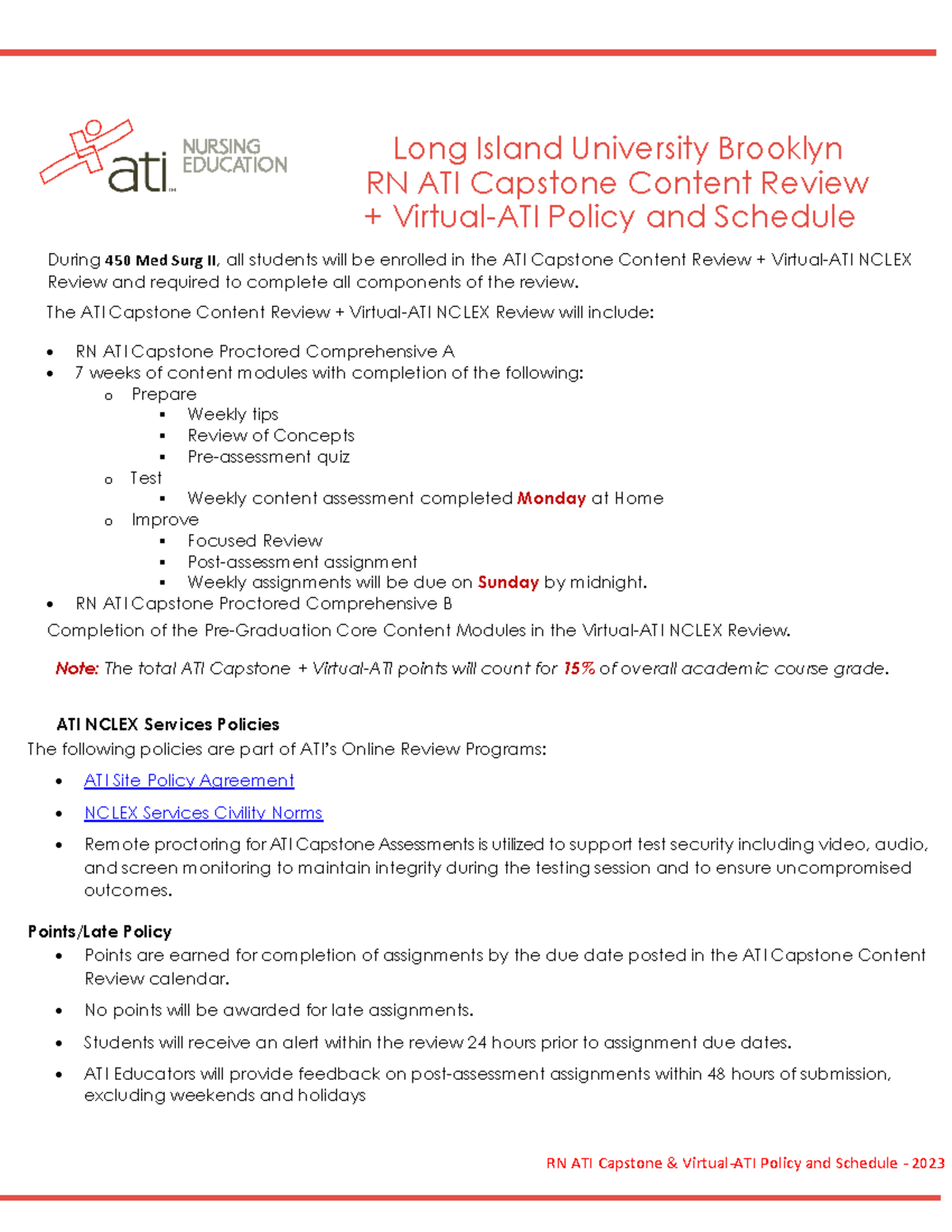 ATI Capstone Calendar 0823 Long Island University Brooklyn RN ATI