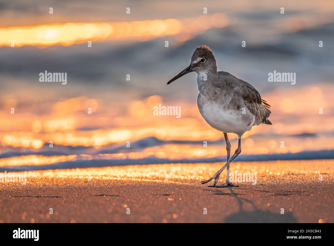 A long legged shorebird standing on the shining golden sand Stock Photo