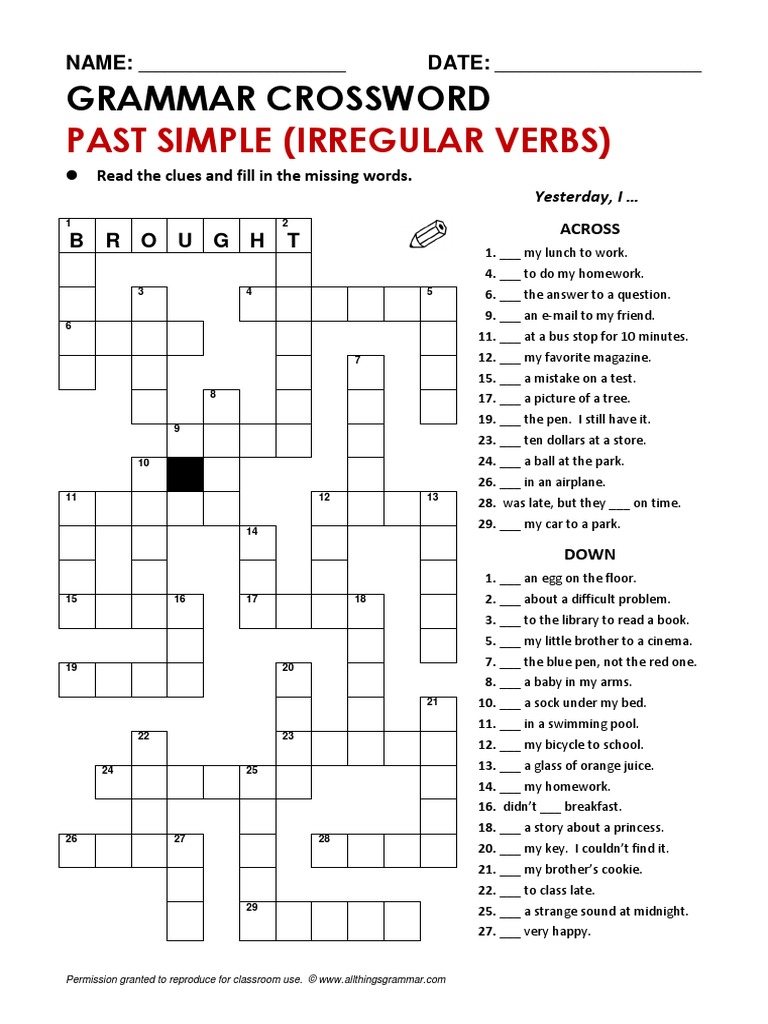 Irregular Past Tense Verbs Crossword Puzzles
