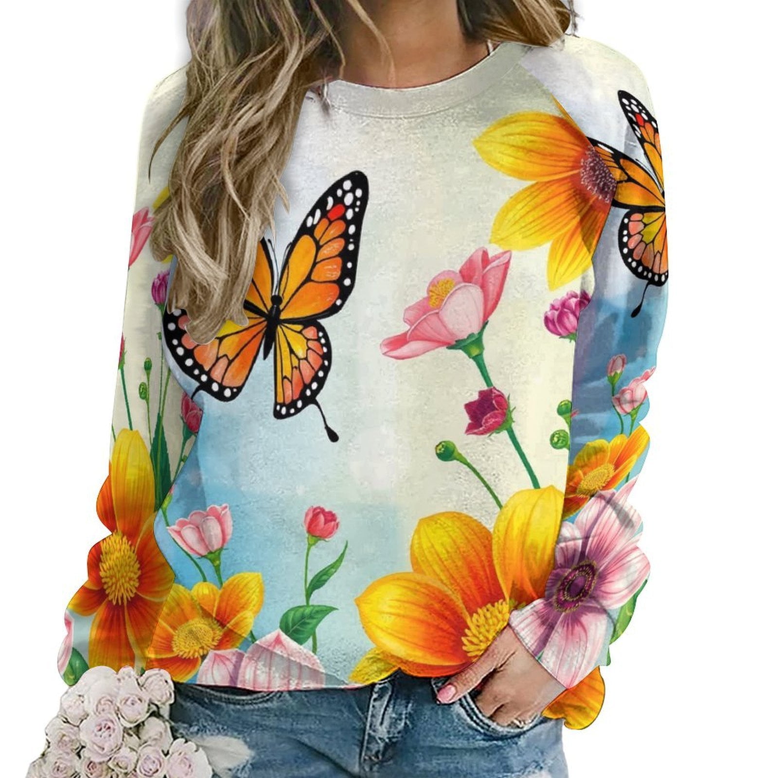 Butterfly Flowers Garden Hoodie Round Neck Long Sleeve Cute Casual