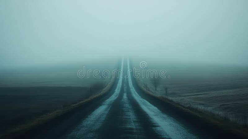 A Foggy Road with a Long Stretch of Grass in the Background Stock