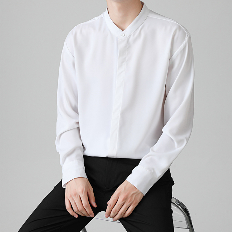 Plain Drape Chinese collar Hidden buckle Dress shirt Loose Business