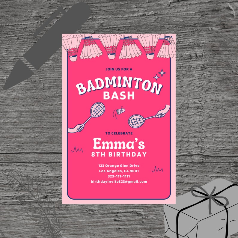 Badminton for Emma Theme Birthday Party Invitation Template Court Game