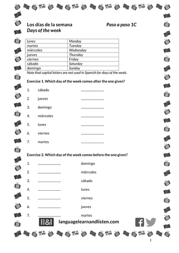 Days of the Week in Spanish: English ESL worksheets pdf doc