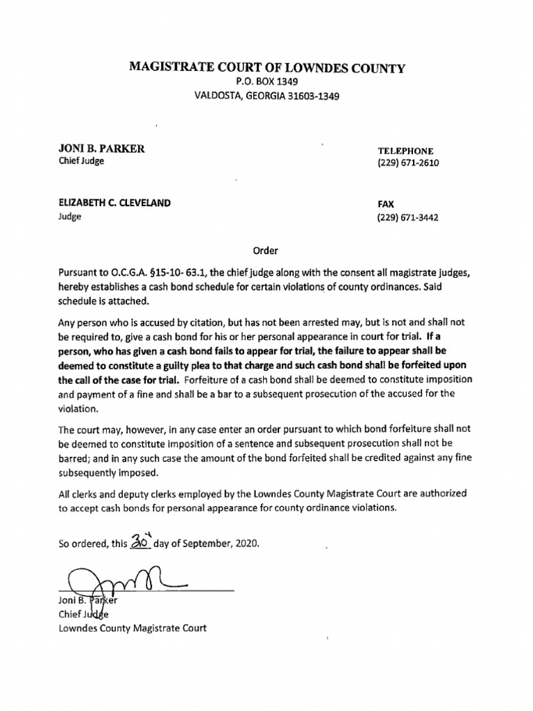 County Ordinance Bond Schedule For The Magistrate Court
