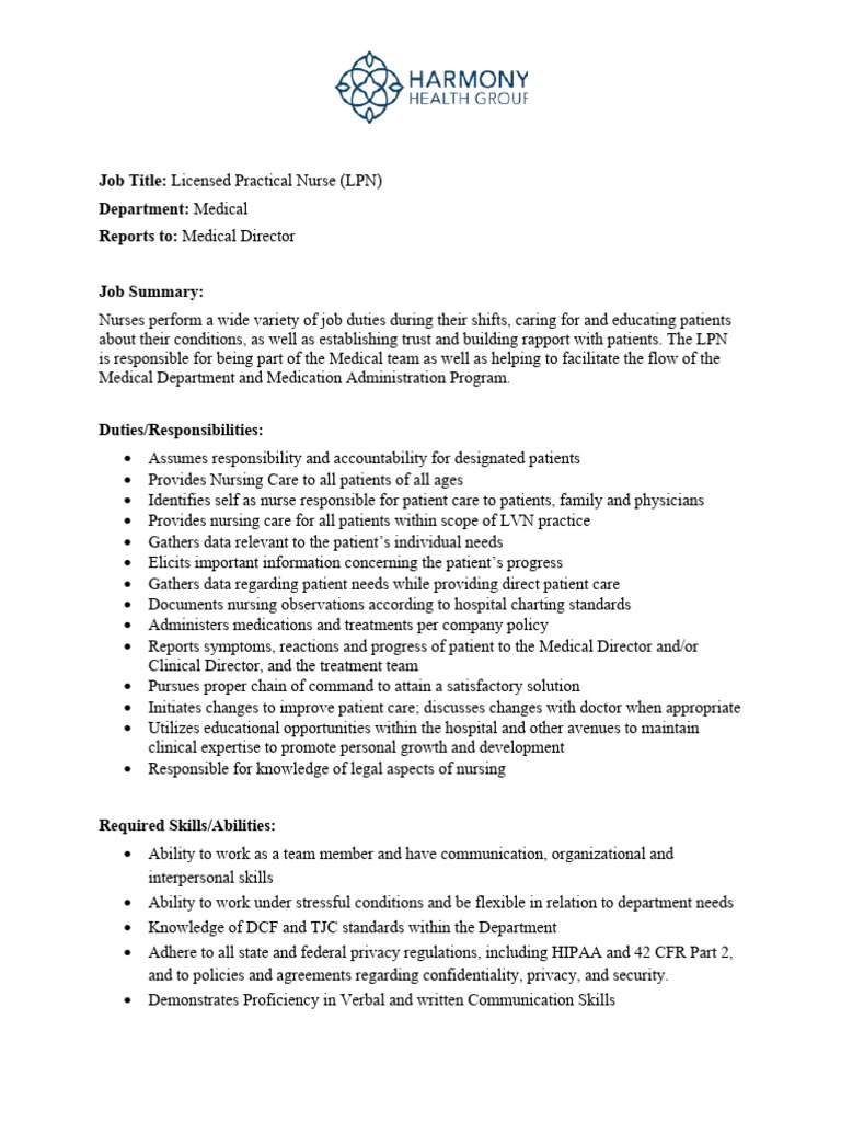 Harmony Landmark LPN Job Description PDF Nursing Medicine