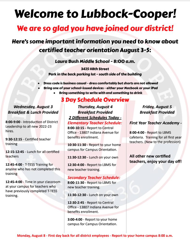 Certified Staff August 3 Info Lubbock Cooper ISD