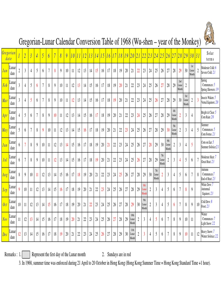 Chinese Calendar 1968 Year of The Monkey 1968 Lunar Calendar
