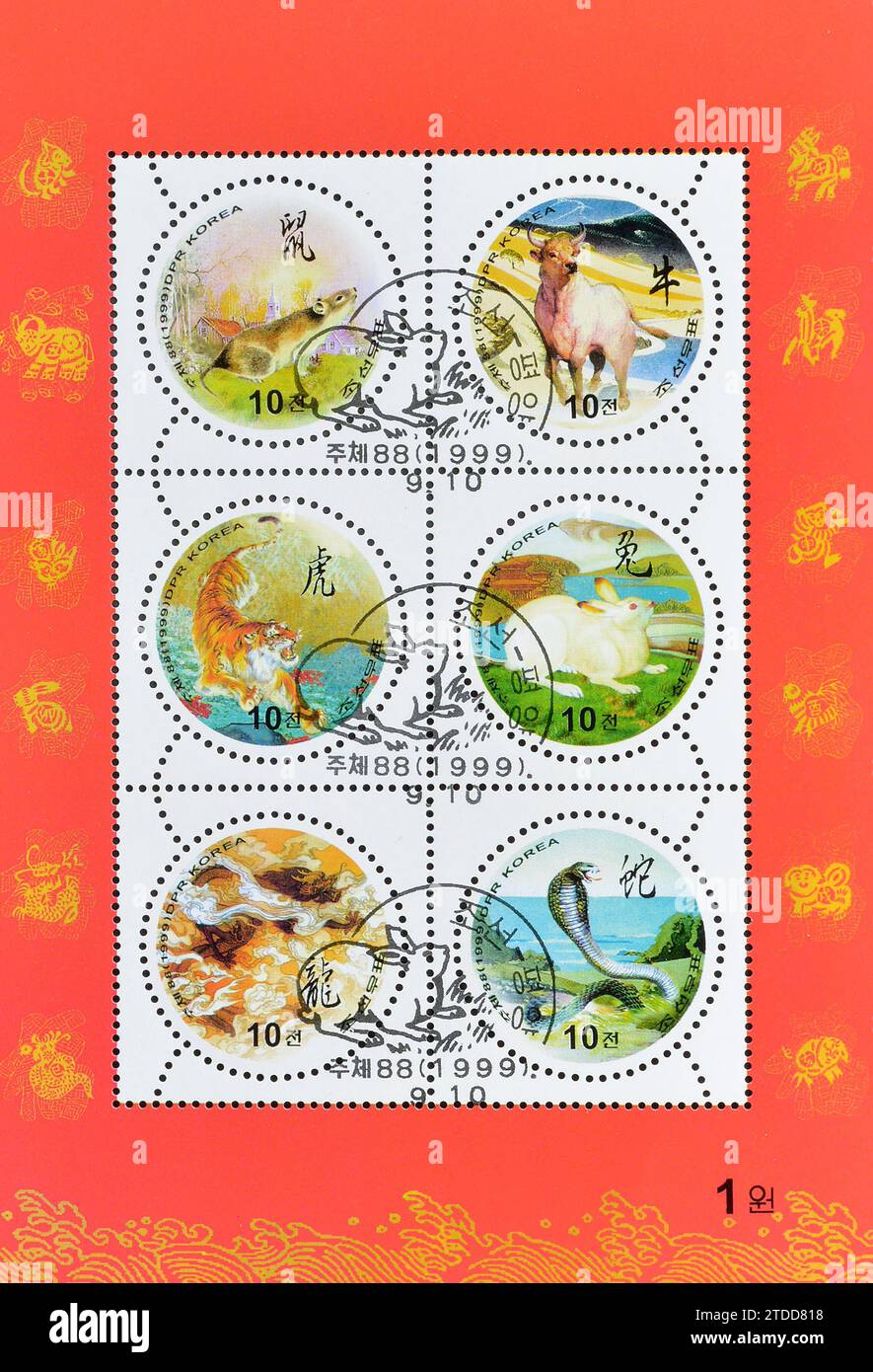 North Korea circa 1999 : Souvenir Sheet with cancelled postage stamps