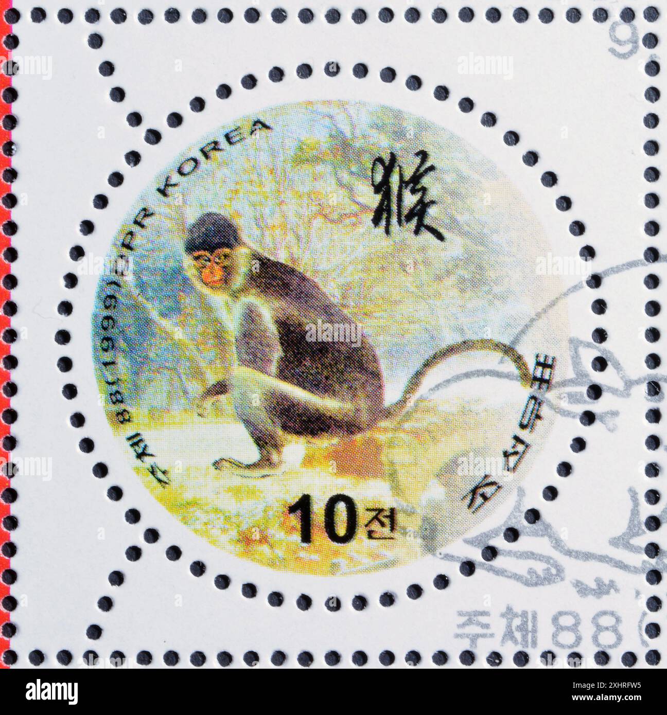 Cancelled postage stamp printed by North Korea that shows Monkey