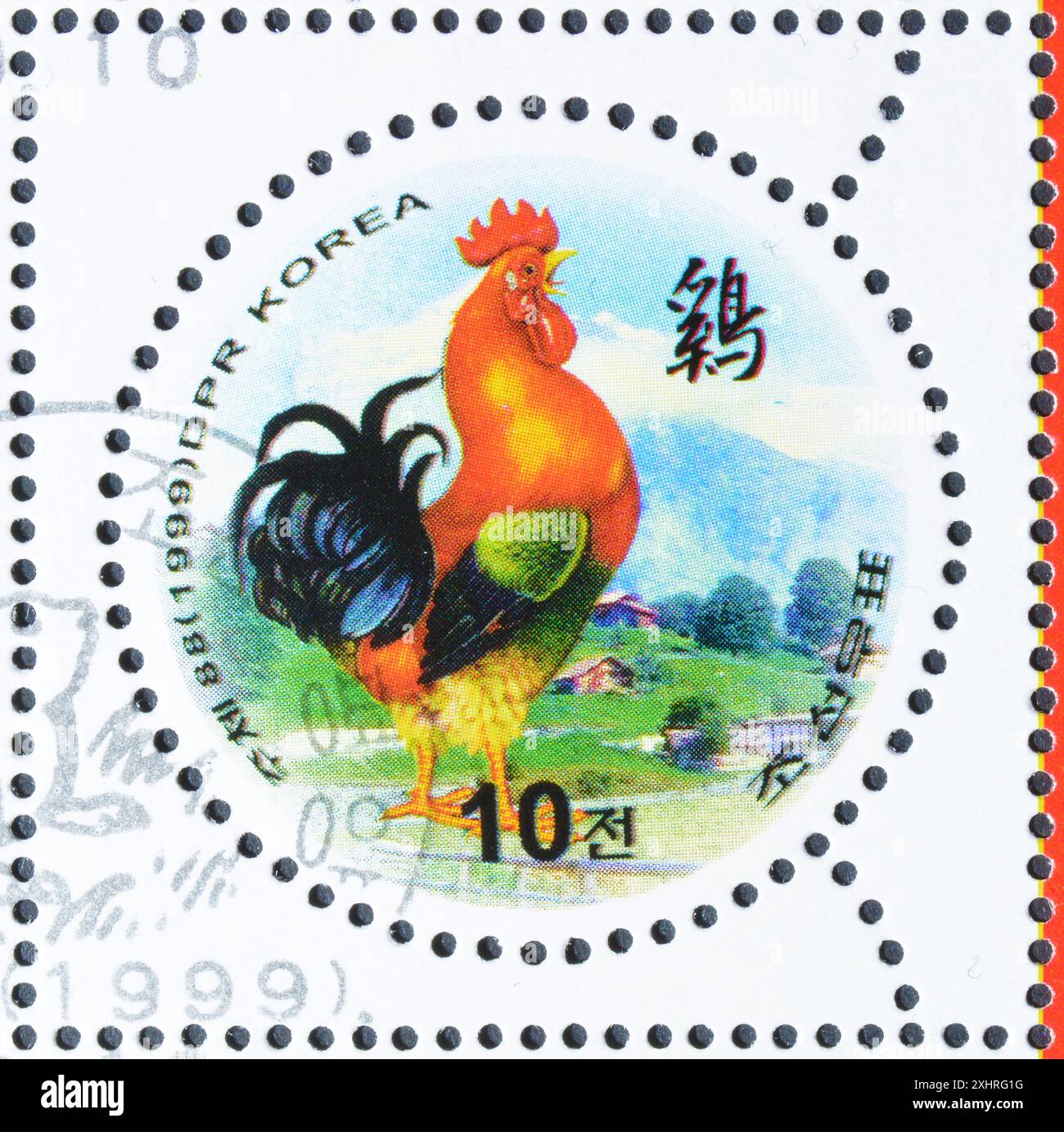 Cancelled postage stamp printed by North Korea that shows Rooster