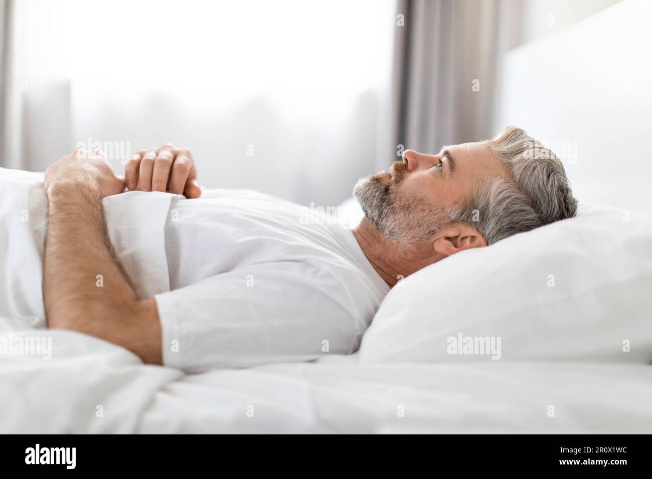 Sad middle aged man lying face up in bed Stock Photo Alamy