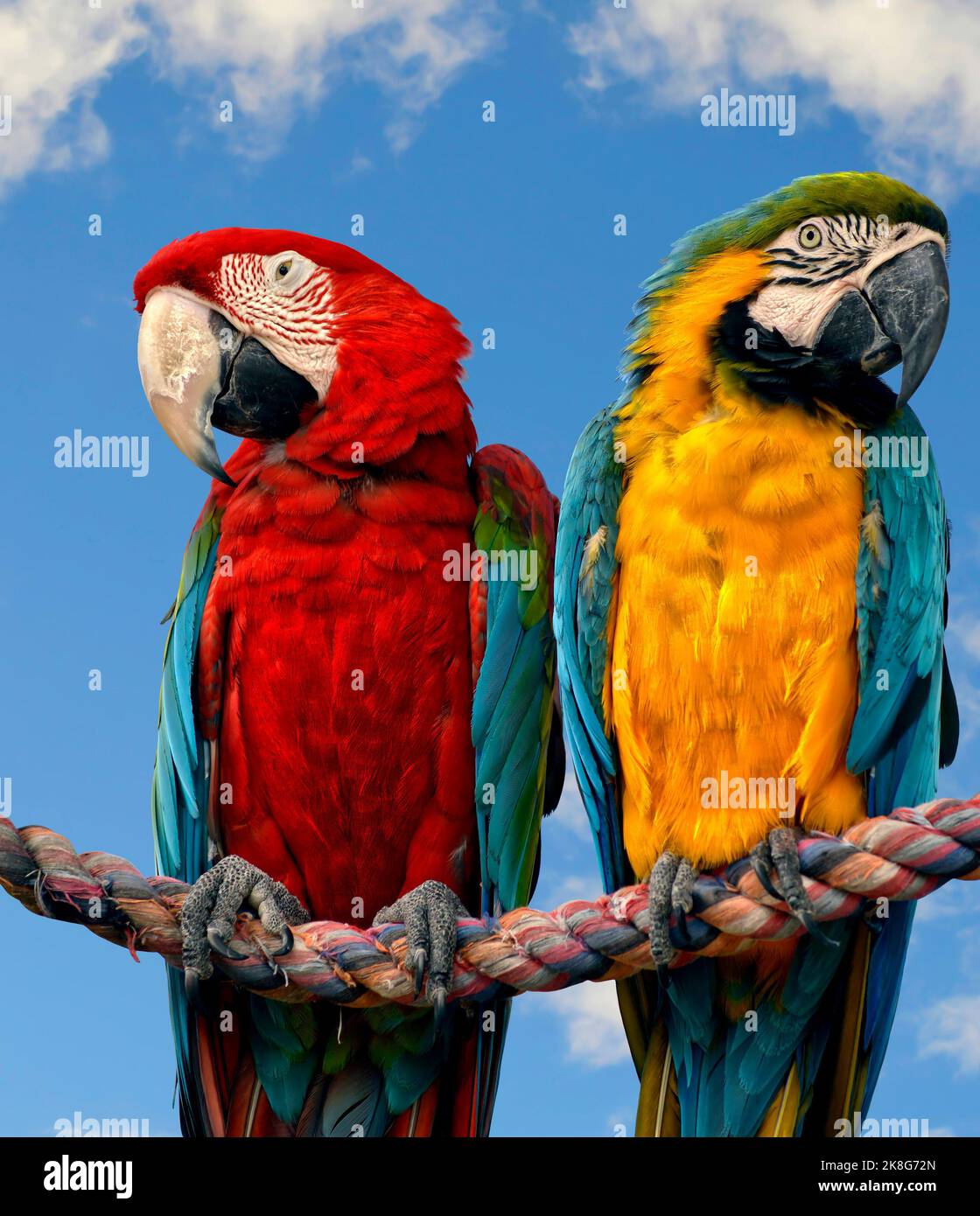 Blue and yellow macaw and a Scarlet macaw perched on a rope Stock Photo