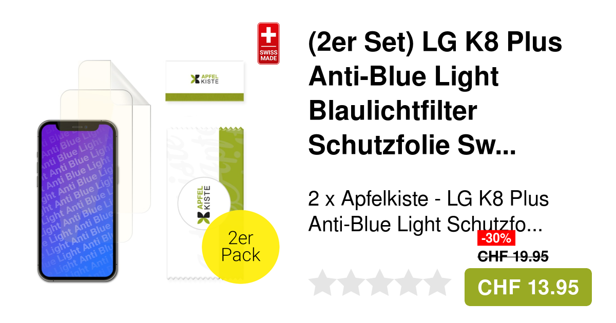 Apfelkiste LG K8 Plus Anti Blue Light Folie Swiss Made (Case Friendly)