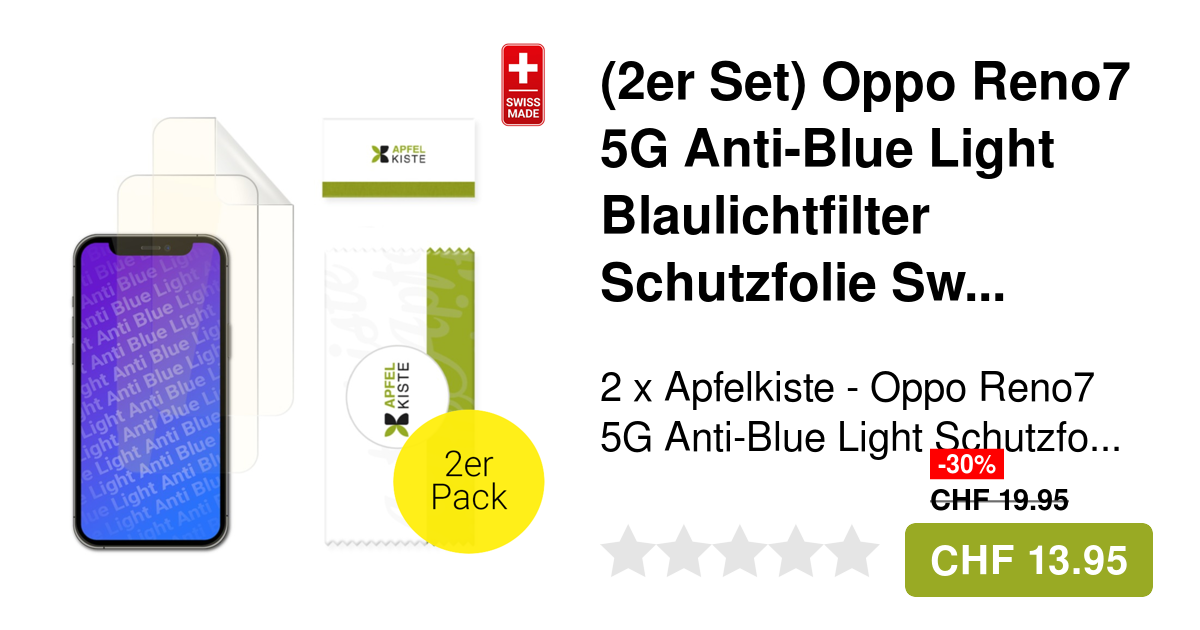 Apfelkiste Oppo Reno7 5G Anti Blue Light Folie Swiss Made (Case Friendly)