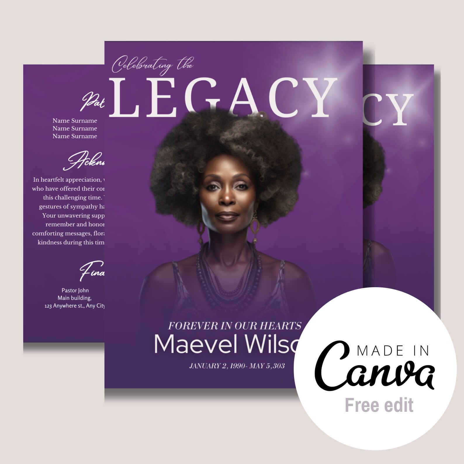17x11in FUNERAL OBITUARY TEMPLATE 8 Pages Purple Funeral Program Vogue