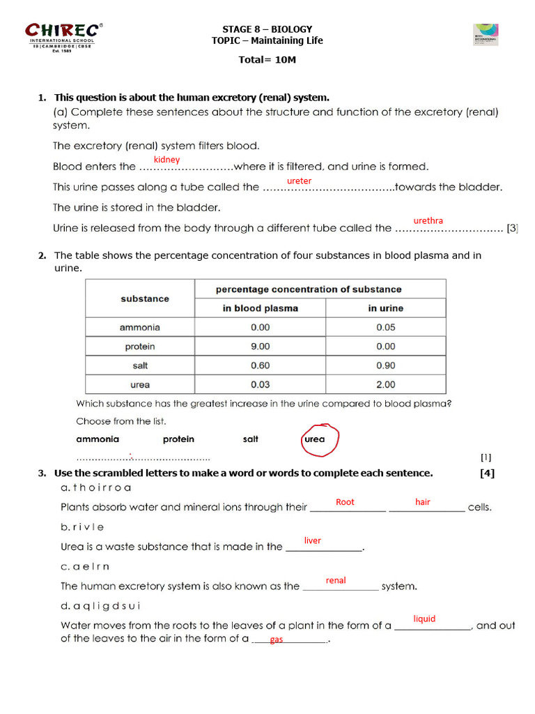 Revision worksheet 2 Maintaining Life answer key PDF