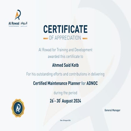 Certificate of Appreciation for conducting the quot Certified Maintenance