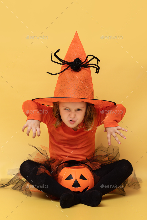Excited kid with pumpkin on Halloween Makes boo grimaces face emotional