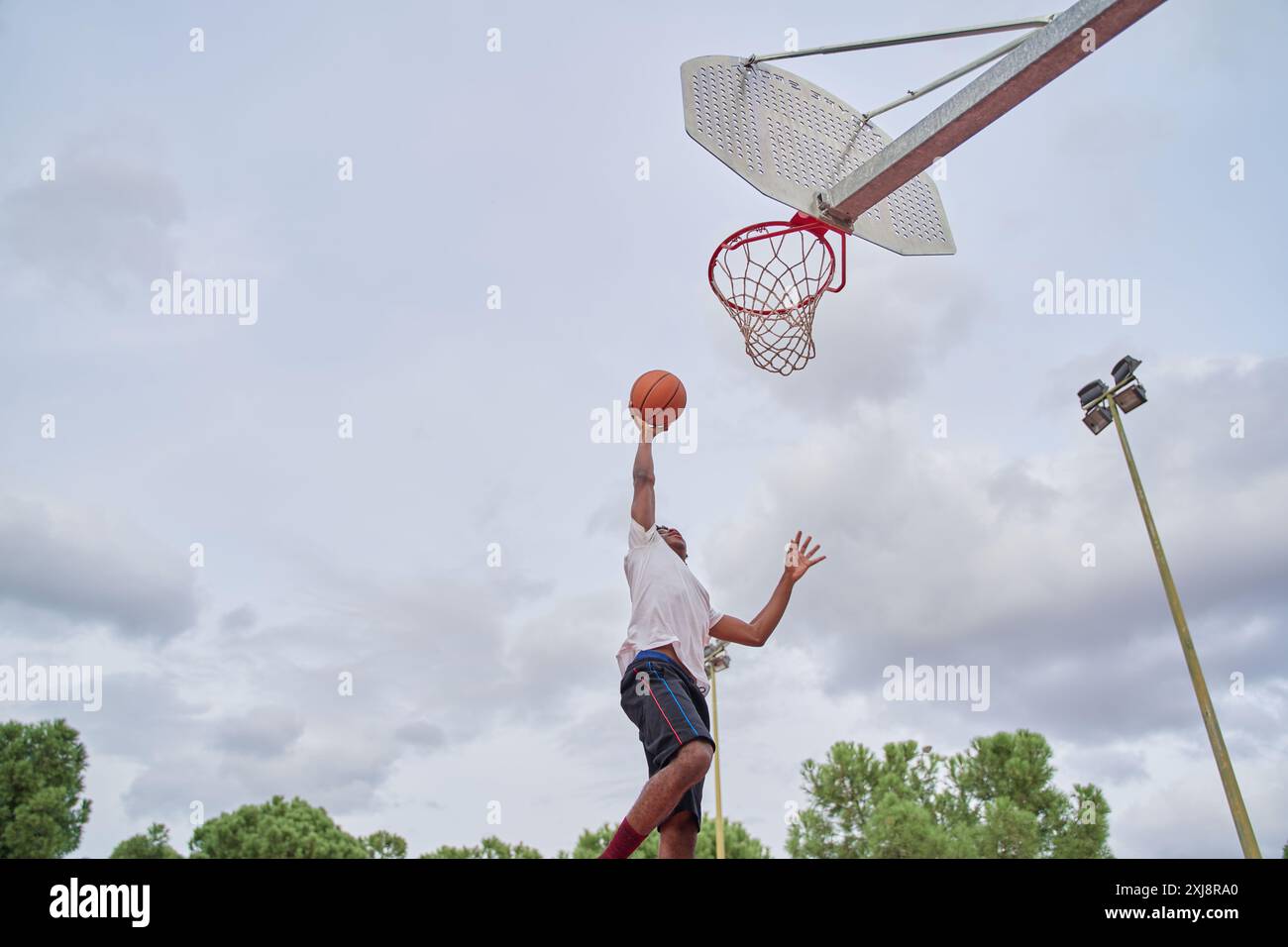 Street basketball player making a powerful slam dunk on the court