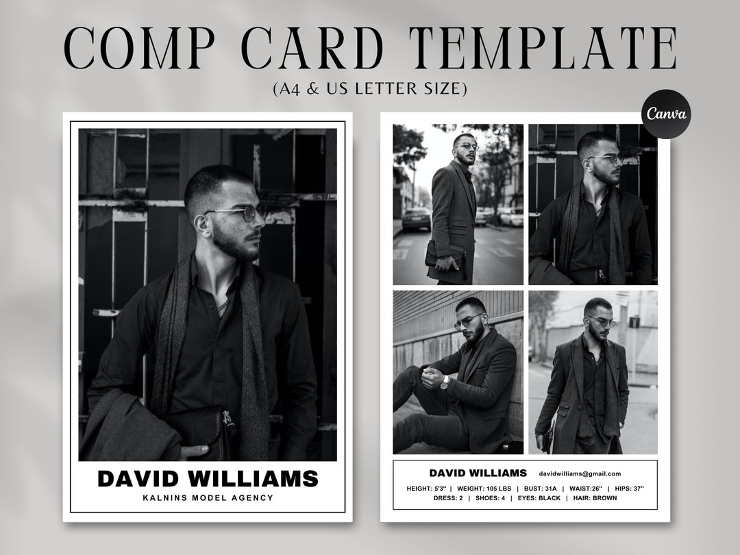 Male Model Comp Card / Canva Template / Actor Men #39 s Fashion Model Zed