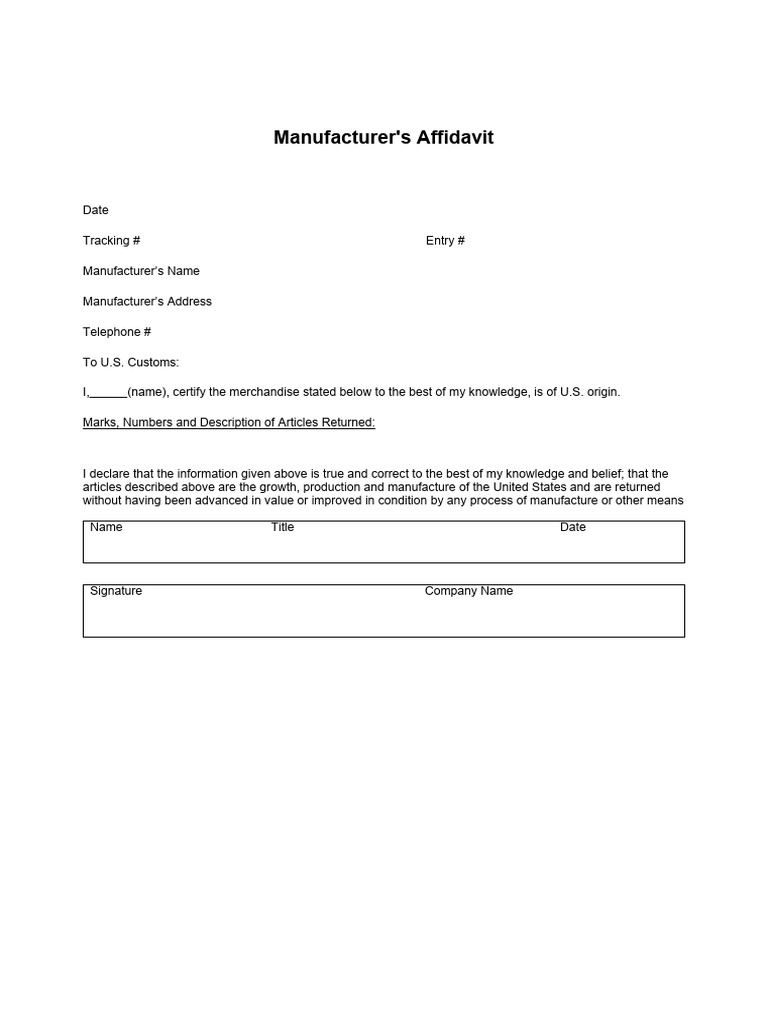 Manufacturers Affidavit Template Fillable prntbl