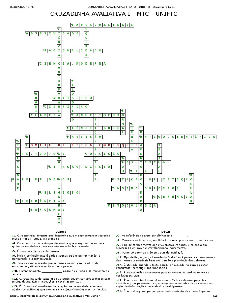 CRUZADINHA AVALIATIVA I MTC UNIFTC Crossword Labs PDF